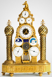 Часы, ставшие предметом гордости французского императора, выполнены в стиле ампир. Позолоченный корпус представлен в виде основания для восьми циферблатов, расположенных пирамидально, т. е. на разных уровнях. Венчает это великолепие небольшая скульптура ангела, играющего на трубе. А по обе стороны циферблатов расположены позолоченные башни с куполами-маковками. Основные элементы корпуса украшены резным цветочным декором.